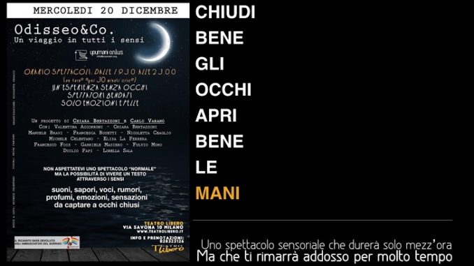 In questa esperienza sensoriale attori e pubblico condivideranno alcuni dei momenti salienti del viaggio di Odisseo, eliminando l’uso della vista, i partecipanti potranno, così, vivere da dentro il viaggio, guidati dagli occhi dell’immaginazione.