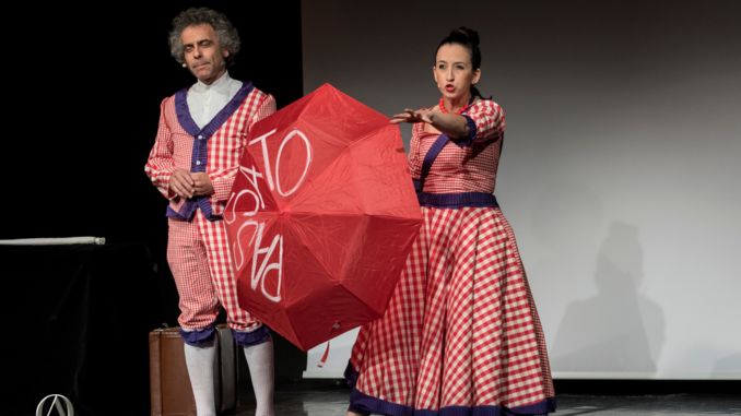 Certo è piacevole, Goethe ce lo ricorda, ascoltare il modo in cui la voce si arrotonda in canto, e come, ad un certo punto, il parlare, colorandosi via via di emozioni, debba necessariamente traguardare nella melodia, e lo sanno bene i Duperdu, ovvero Marta M. Marangoni e Fabio Wolf. Ci si trova di fronte ad una coppia affiatata al punto che l’uno si lascia respirare dai fiati scenici dell’altro, per scriverla manzonianamente, di quel securo fulmine (di Fabio), tenea dietro il baleno (di Marta). I due omaggiano i Milano, e declinano il loro spettacolo secondo la loro personalissima sensibilità artistica, un’intelligente clownerie si intervalla a momenti di musica, in cui si srotola la storia di Milano, da Belloveso, al drago Tarantasio, passando attraverso la cascina California e Leonardo insieme al suo allievo più ostinatamente con i pugni in tasca, Gian Giacomo Caprotti.